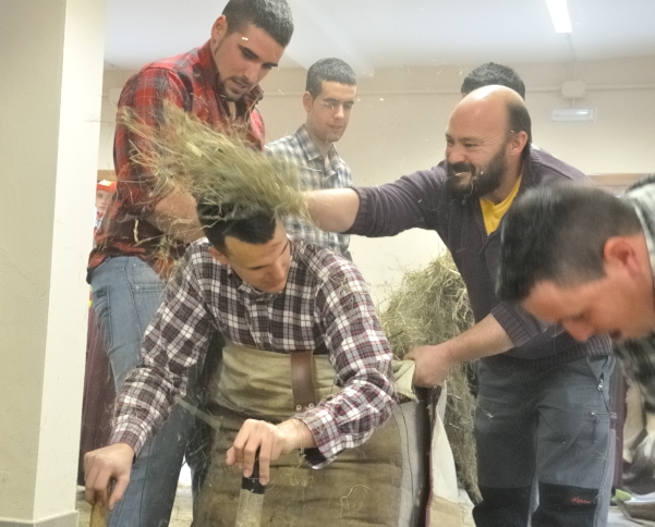 Kilos de hierba que harán que el recorrido por las calles en esta fiesta sea muy duro para Onso, que será guiado por el domador y para ello le golpeará en la espalda con una estaca.Sujetando las pieles y cornamenta a uno de los mozos para convertirlo en un personaje milenario, las trangas