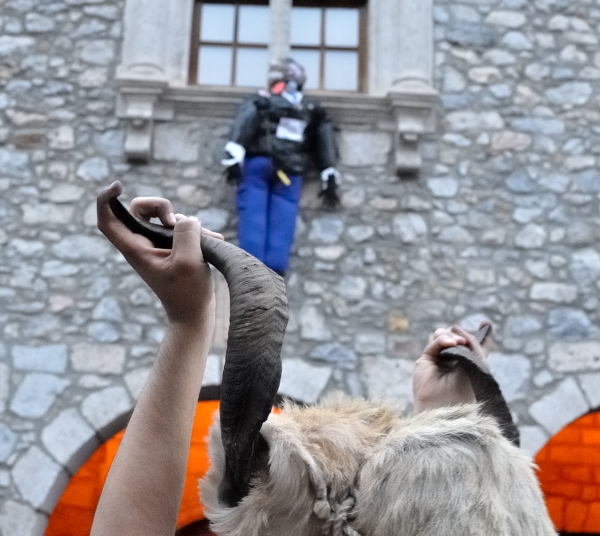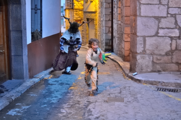 Pintarán sus caras de negro y colocarán los dientes postizos, su aspecto es imponenteLos cencerros colocados en sus cinturones, suenan al andar y avisan de su embestidaCada uno con su tranca esperando empezar, pasa el tiempo y el ambiente se llena más de magia