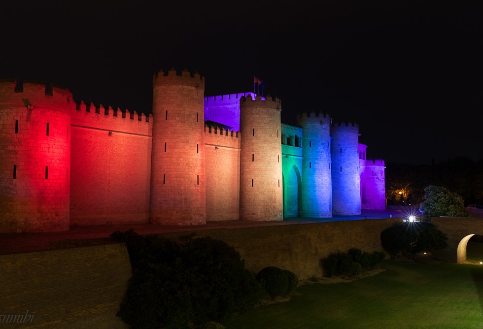 Cortes de Aragón, sobre la arquitectura mudéjar de la Aljafería, se proyectan los colores del Orgullo y la Lucha LGTBI./Spanish Parliament of Aragon, on the Mudejar architecture of the Aljafería, projects the colors of the Pride and the Fight LGTBI.